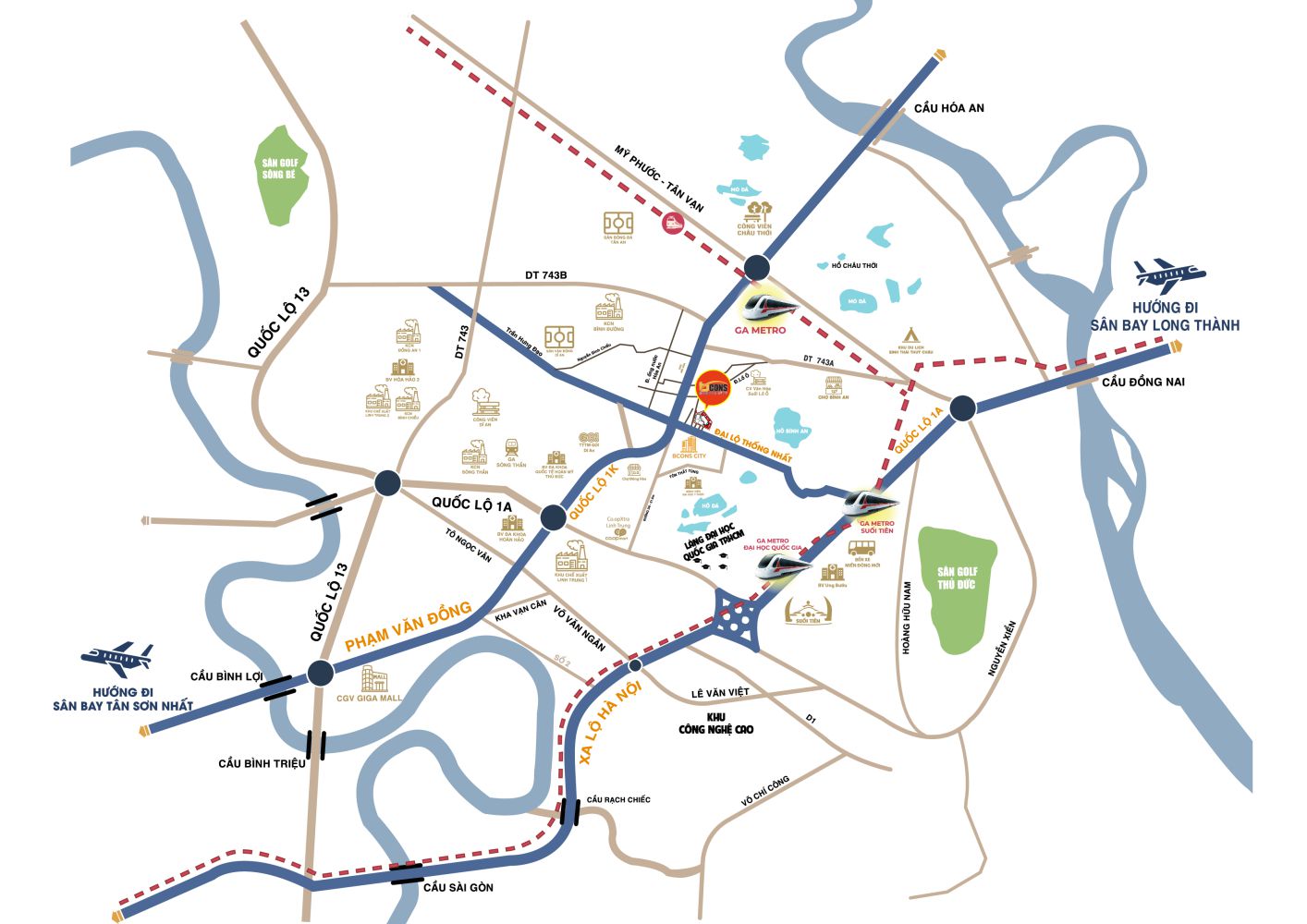 Bcons Center City nằm trong vùng lõi của hạ tầng giao thông hiện hữu và tương lai, nổi bật nhất là tuyến Metro số 1 (Bến Thành – Suối Tiên) – biểu tượng của giao thông hiện đại TP.HCM.
